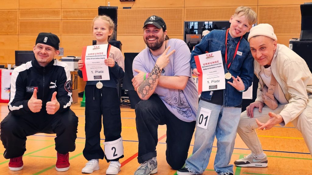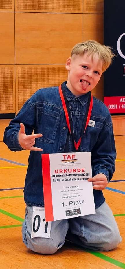 Bei den Minikids erreichte Teddy Gries ebenfalls zwei Siege, er darf sich nach zwei großartigen Vorstellungen Ostdeutscher Meister im Solo Freestyle und im Popping nennen.