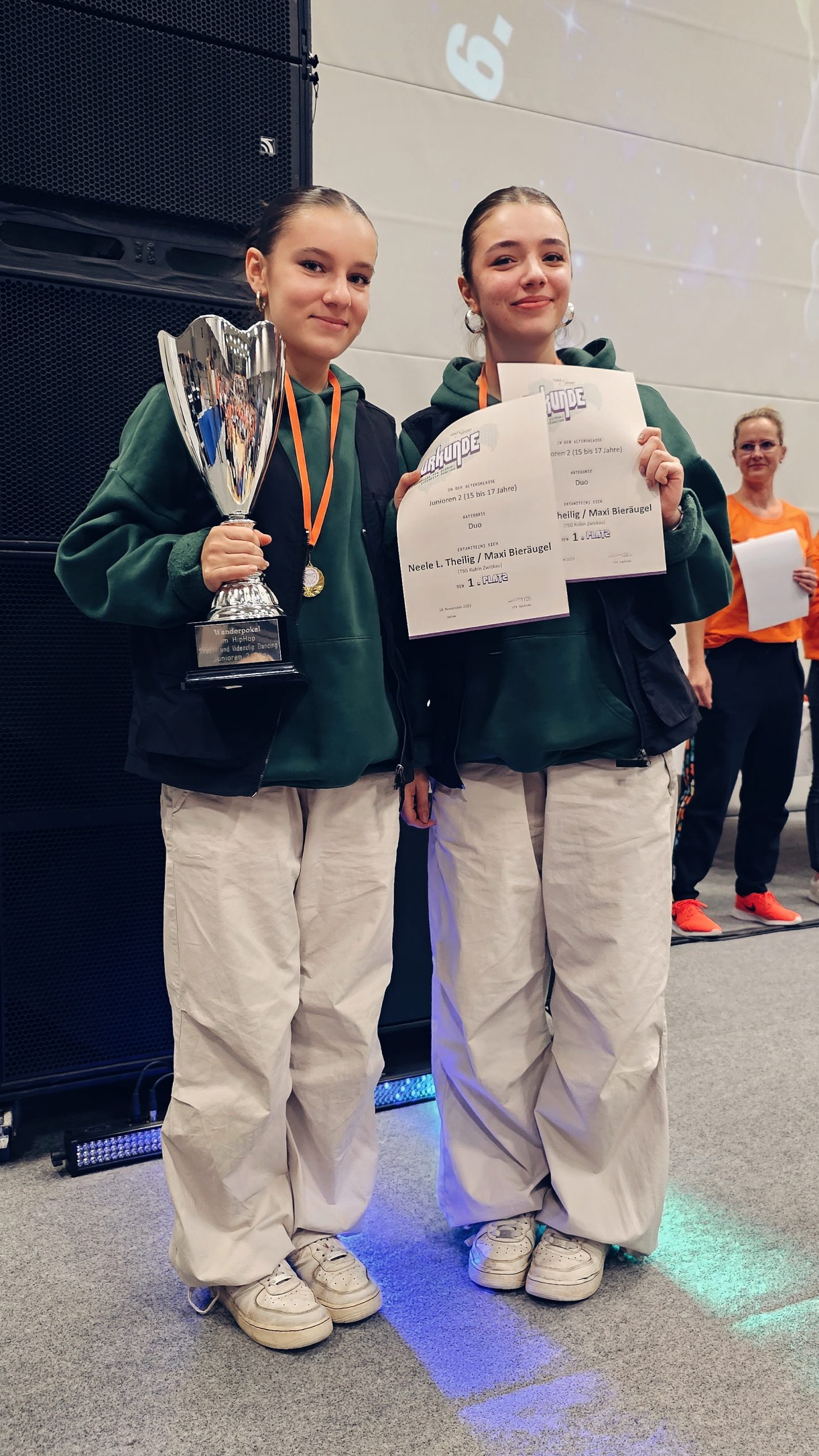 Für weitere Höhepunkte sorgten die Solistin Anika-Sophie Gehrisch und das Duo Neele-Lilly Theilig und Maxi Bieräugel (alle Junioren II). Anika-Sophie gewann nach Zwickau und Chemnitz auch in Grimma souverän und konnte seit 2018 schon zum 6. Mal in Folge den Sachsenpokal mit nach Hause nehmen. Unangefochten zum dritten Sieg dieser Saison und auch zum dritten Sachsenpokalsieg in Folge tanzte sich das Duo von Neele-Lilly und Maxi.