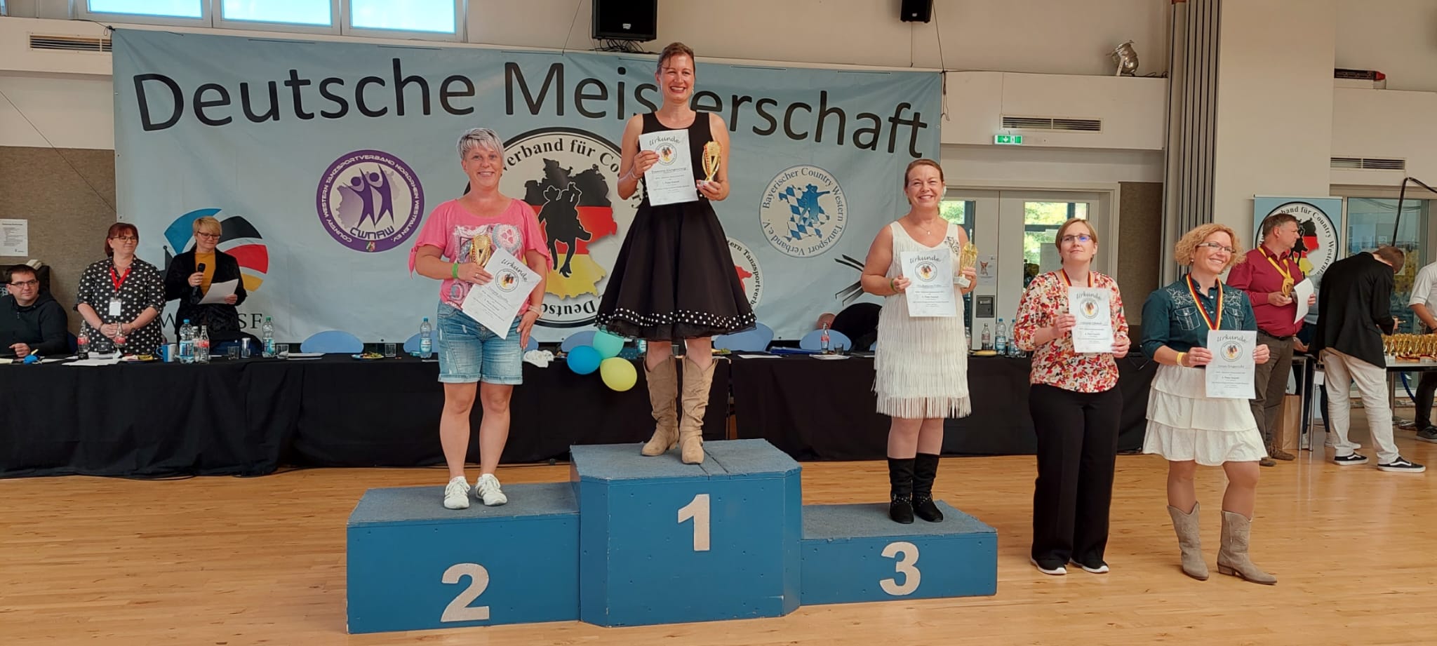 Bereits am Freitag starteten Kerstin Graf, Violetta Schlemmer und Ramona Gläser ihre erste Vorrunde. In ihrer Klasse „Line Dance Newcomer Female Silver“ hatten sich 22 Tänzerinnen angemeldet und nur 8 durften sich für das Finale am Sonntag qualifizieren. Da hieß es für die Wertungsrichter genau hin zu schauen, wer die Besten 8 sind. Violetta Schlemmer konnte sich direkt für alle 4 Tänze einen Finalplatz sichern. Ramona Gläser schaffte es mit 2 Tänzen ins Finale. Am Samstag fand dann die 2. Vorrunde statt, leider reichte es bei Kerstin Graf nicht fürs Finale, trotzdem waren ihre beiden Trainerinnen zufrieden, denn bei 22 Teilnehmern ist es auch schwer, weiter zu kommen, immerhin sind nur 2 Minuten Tanzzeit für die Auswahl. Nach dem Finale konnte sich Ramona Gläser über einen 4.Platz freuen und Violetta Schlemmer holte den Titel „Deutscher Meister“ nach Zwickau.