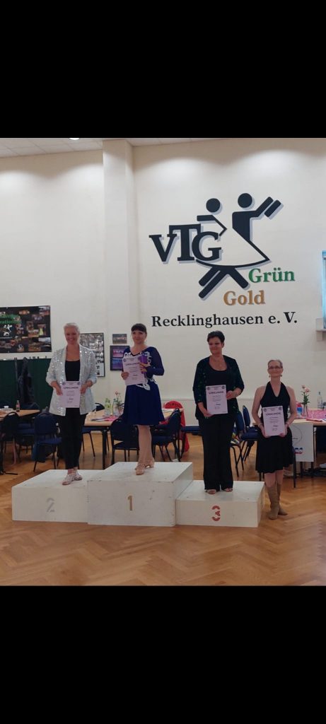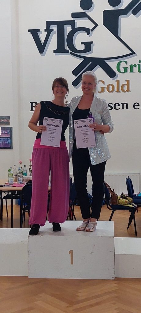 Am Wochenende richtete der Country Western Tanzsportverband Nordrhein Westfalen seine erste Landesmeisterschaft im Linedance aus. Um die Sommerpause zu überbrücken nahmen 4 Tänzer der TSG Rubin Zwickau die knapp 500 km weite Anreise nach Recklinghausen auf sich, um an dem Turnier teilzunehmen und bei den angebotenen Workshops Neues zu lernen. Da nur knapp 50 Teilnehmer angemeldet waren, war die Atmosphäre fast familiär. Trotzdem war die Aufregung nicht weniger groß bei den Tänzern. Vor allem für Anke Kammel wurde es ein stressiger Vormittag. Hatte sie sich doch entschieden, in 2 verschiedenen Kategorien anzutreten. Und so blieben ihr teilweise nur 4 Minuten Zeit zum Umziehen und Luft holen. In ihrer Leistungsklasse Breitensport Fortgeschrittene konnte sie sich am Ende über den Sieg freuen. Bei der 2. Kategorie „Modern Linedance“ werden 3 Tänze getanzt. Das Besondere hier ist, dass Teilnehmer aus unterschiedlichen Leistungsklassen gegeneinander tanzen. Und so kam es, dass sie mit ihrer Trainerin Uta Rösner, die bereits in der Leistungsklasse Novice tanzt, nur zu zweit auf der Tanzfläche stand, da keine weiteren Teilnehmer gemeldet waren. Am Ende gewann Uta Rösner, aber einen Tanz konnte Anke Kammel für sich entscheiden. Für Uta Rösner gehört auch Anke der Sieg für ihren Mut, sich dieser Herausforderung zu stellen. Beide hatten auf jeden Fall ihren Spaß bei diesem Battle, war es doch wie im Training, sogar die Positionen auf der Tanzfläche waren zufällig wie beim wöchentlichen Training.