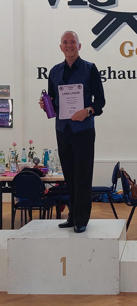 Heiko Podszus hatte sich erst vor 3 Wochen entschieden an dem Turnier teil zu nehmen in seiner neuen Leistungsklasse Novice. Dafür musste er in der kurzen Zeit noch 2 Tänze lernen. Aber auch er wurde mit einem Sieg belohnt und konnte sich einen Punkt im Ranking sichern. Er ist sich sicher, dass die Zwickauer einen bleibenden Eindruck in NRW hinterlassen haben, was nicht nur an den roten VereinsT-Shirts der TSG Rubin gelegen haben wird.