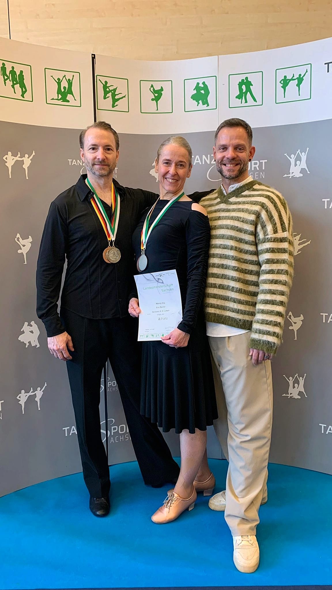 Am Samstag starteten Mandy Hoy und Eric Rector sowohl bei den Senioren III D als auch in der jüngeren Altersklasse – Senioren II D. Nur noch wenige Punkte fehlten ihnen zum Aufstieg, den sie gern zur LM schaffen wollten. Um 10:00 Uhr begann der Wettkampf und sie erreichten sofort das Finale. Motiviert starteten sie gegen 12:30 Uhr erneut und freuten sich am Ende über den Vizelandesmeistertitel und den Aufstieg in die nächsthöhere Klasse. Hier tanzten sie ebenfalls und erreichten Platz 3 der Landesmeisterschaften.