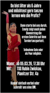 Für alle, die älter sind als sechs Jahre bietet unsere erfahrene Turniertänzerin Emely ab Donnerstag, den 05. März 2026 eine neue Tanzmöglichkeit an.